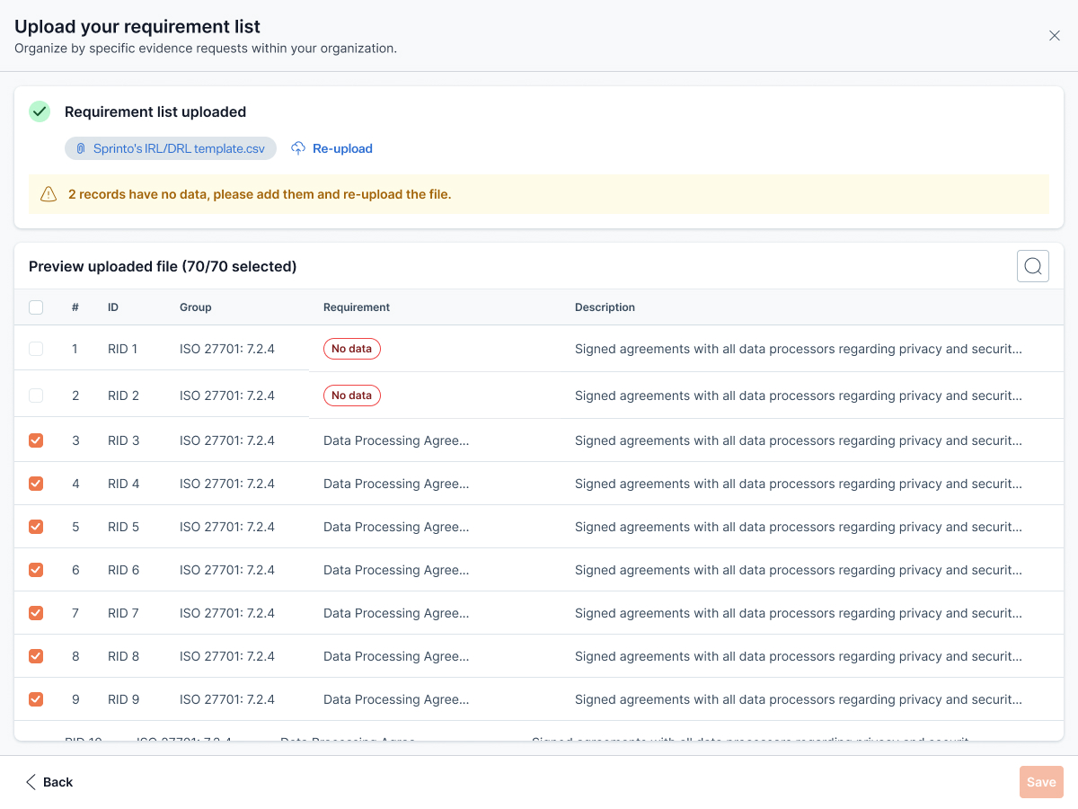 5. Select **Save** to confirm and import your requirements.