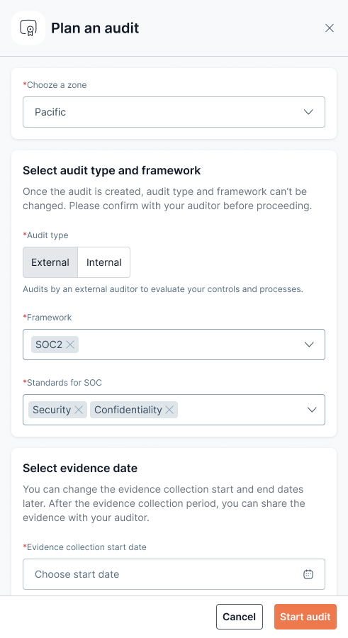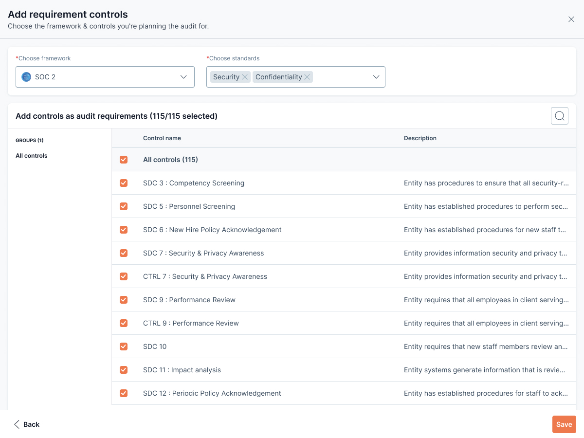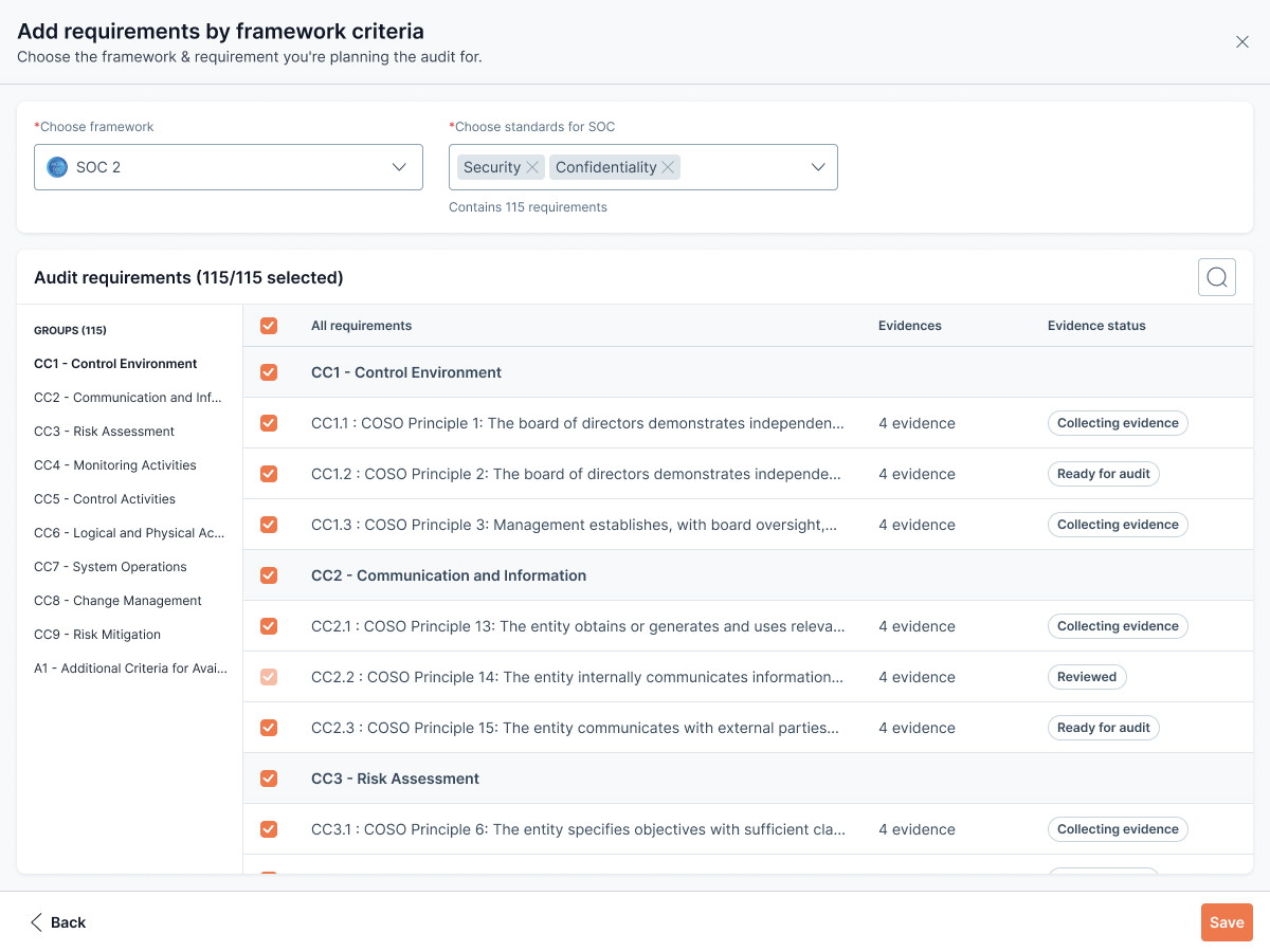 * **Framework**: Select the applicable compliance framework (e.g. SOC 2).