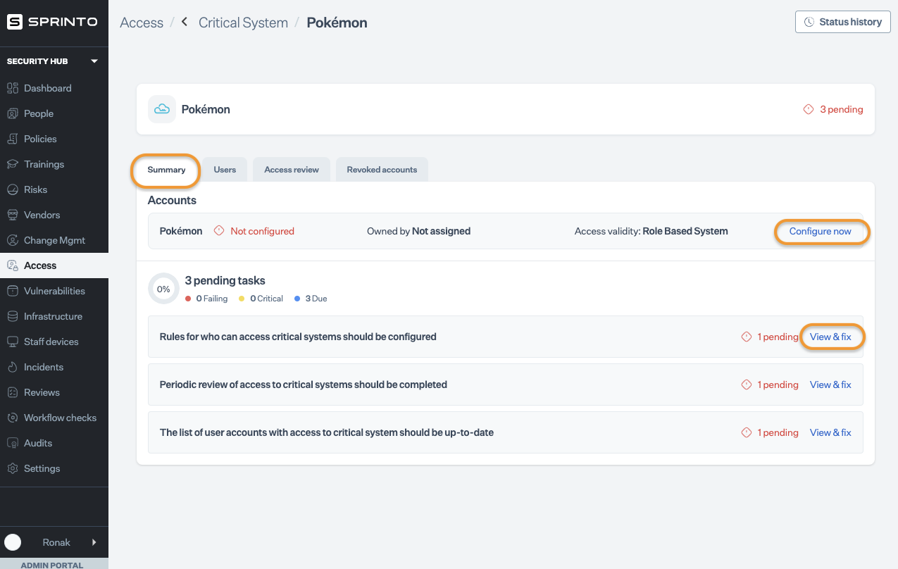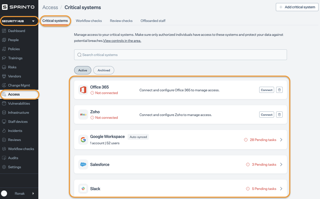 1. Navigate to Security Hub > Access > Critical Systems and select the desired critical system from the list. Use the search bar for quick navigation.