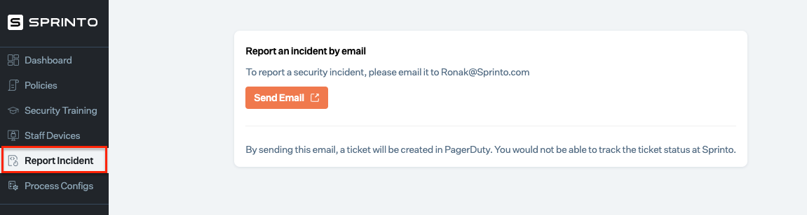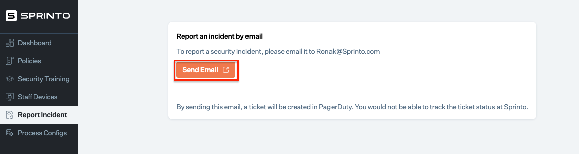 The following procedure describes about how report an incident by sending an email when you have the PagerDuty account integrated on Sprinto as your incident ticket management option. You can send email defining the incident details in the mail, this will log the incident ticket on the Sprinto Platform.