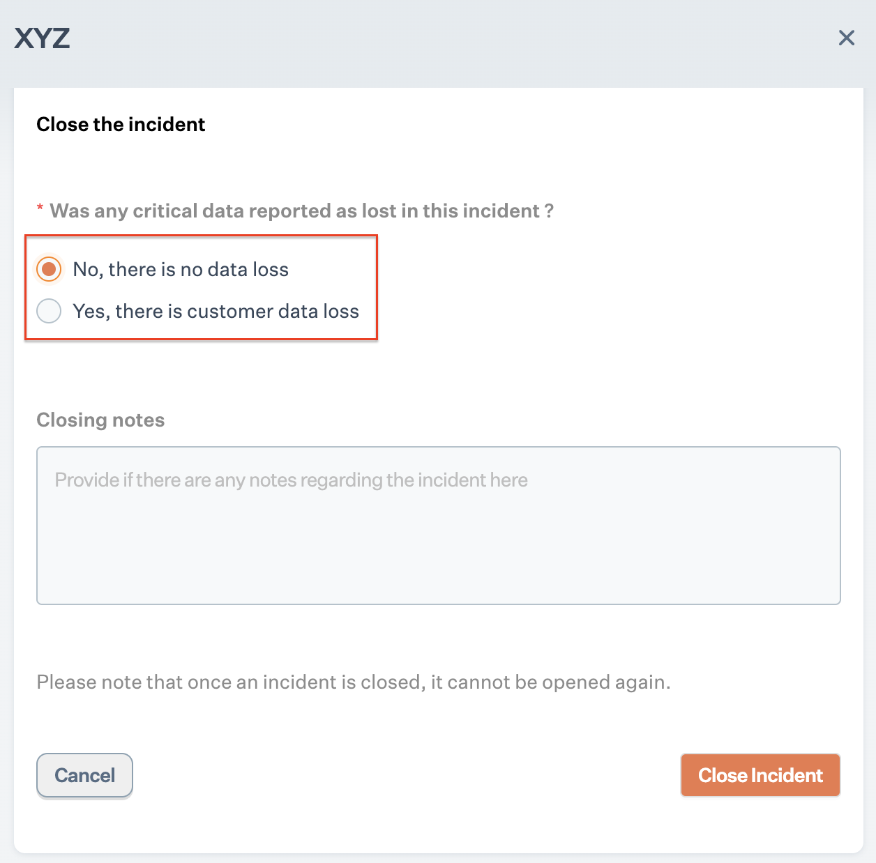 Reflects if there is any form of data loss from the logged incident, the following can be status for the data loss: * Yes * No