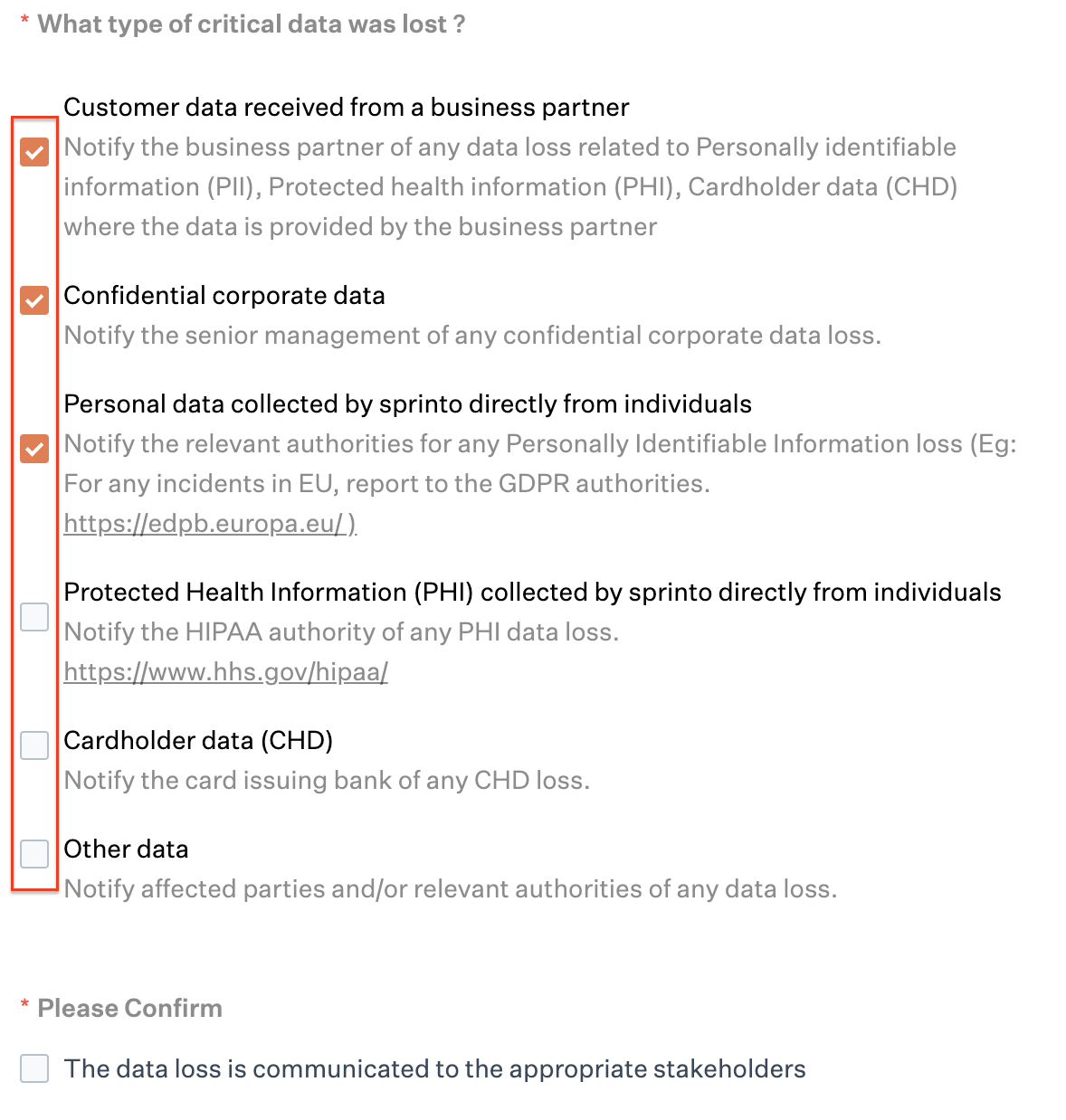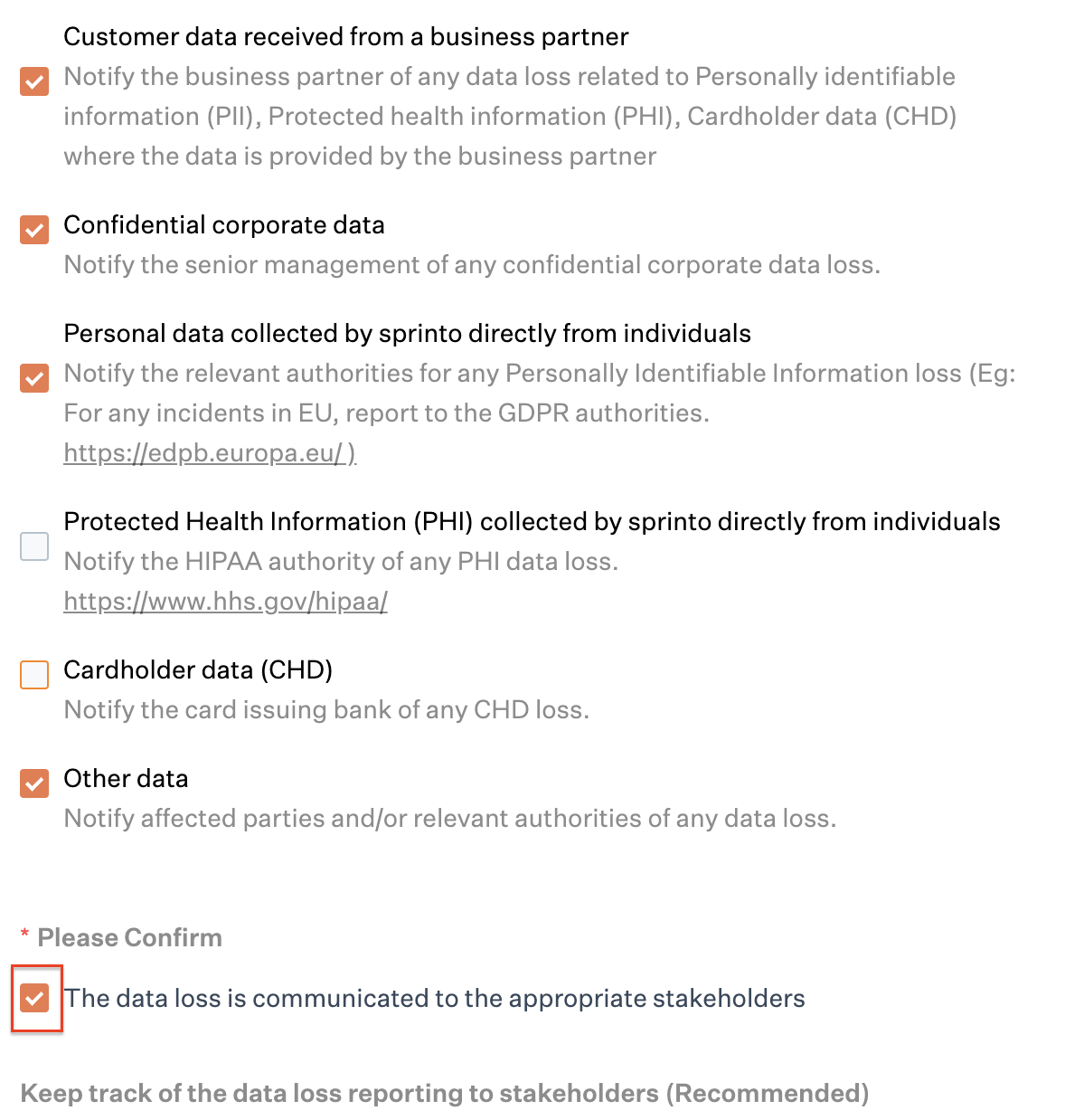 * If there is a protected health information loss of a individual collected directly by Sprinto. * Report to the HIPPA for any PHI data loss.