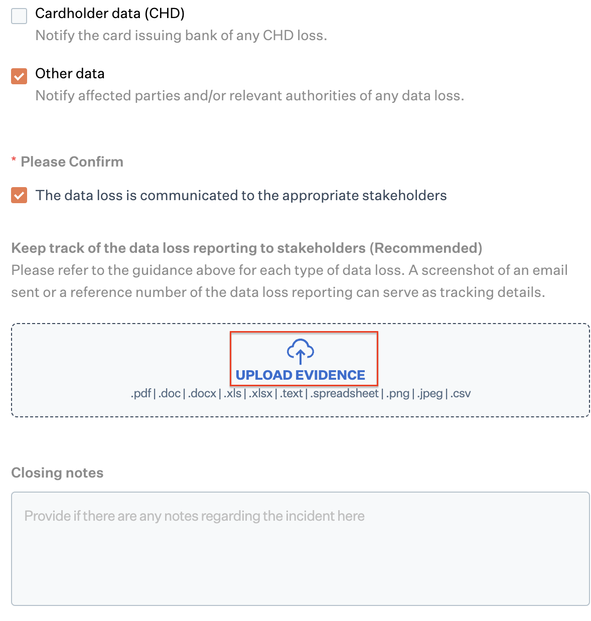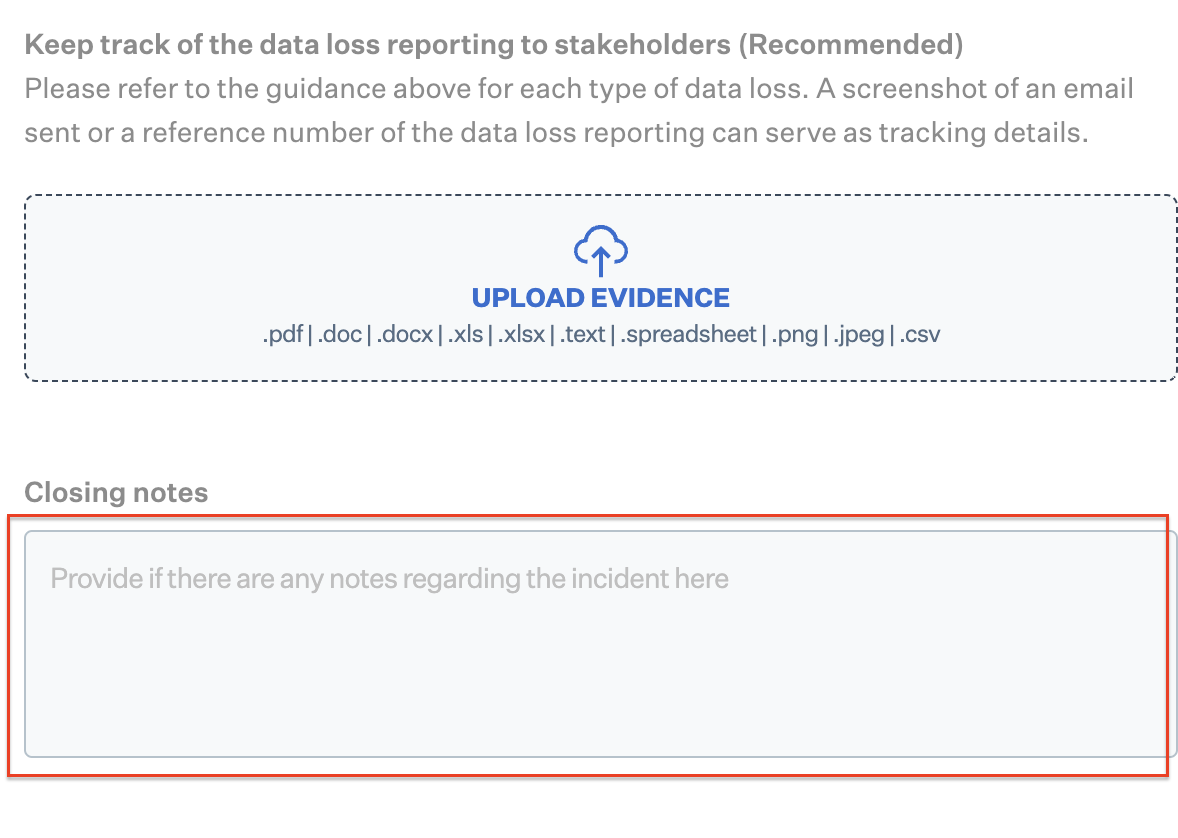 Note: You can upload the reporting email or reporting reference number that can be used to track the data loss reporting.