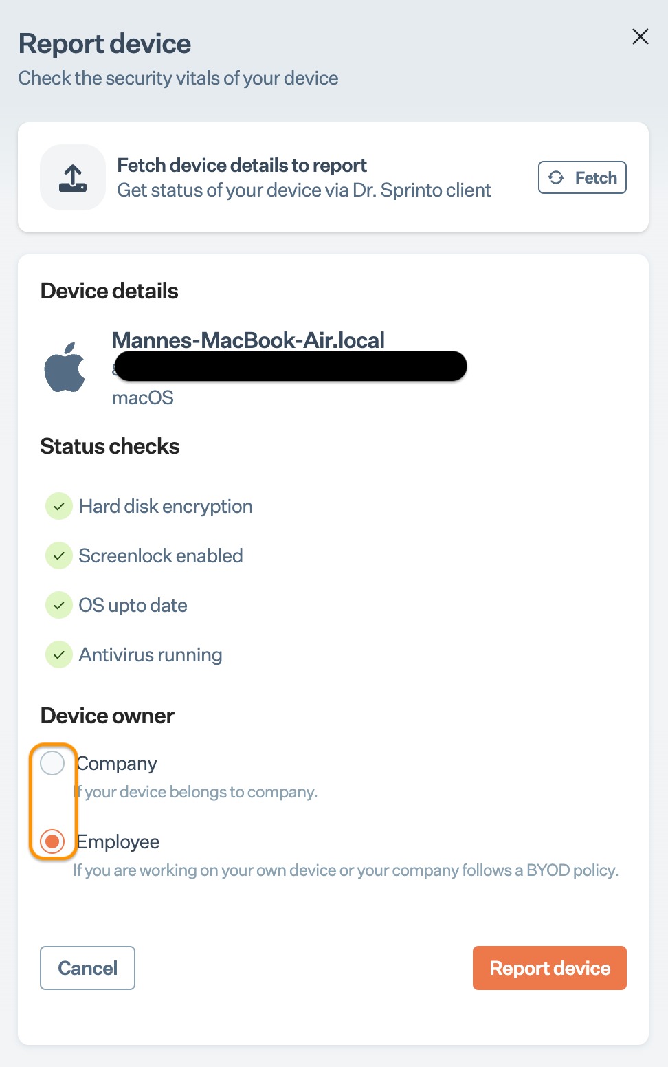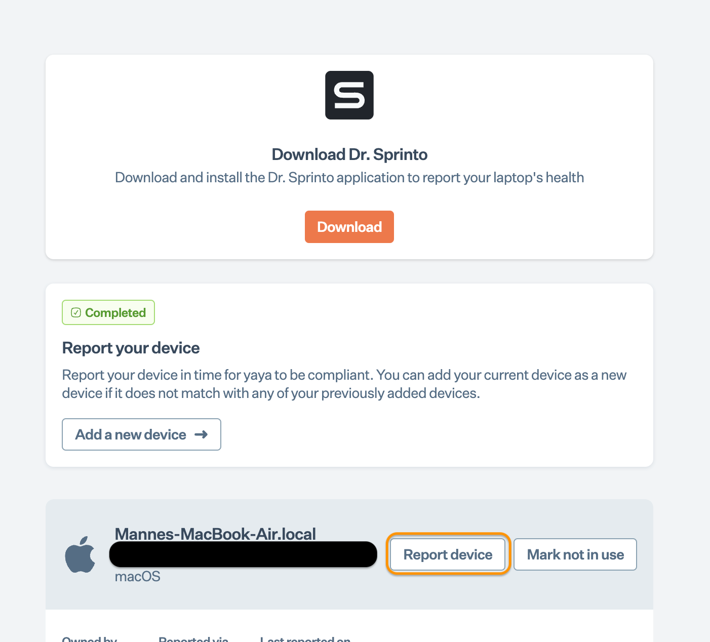 * On the Sprinto employee portal, Click **Report Device** under **Your Devices** section.