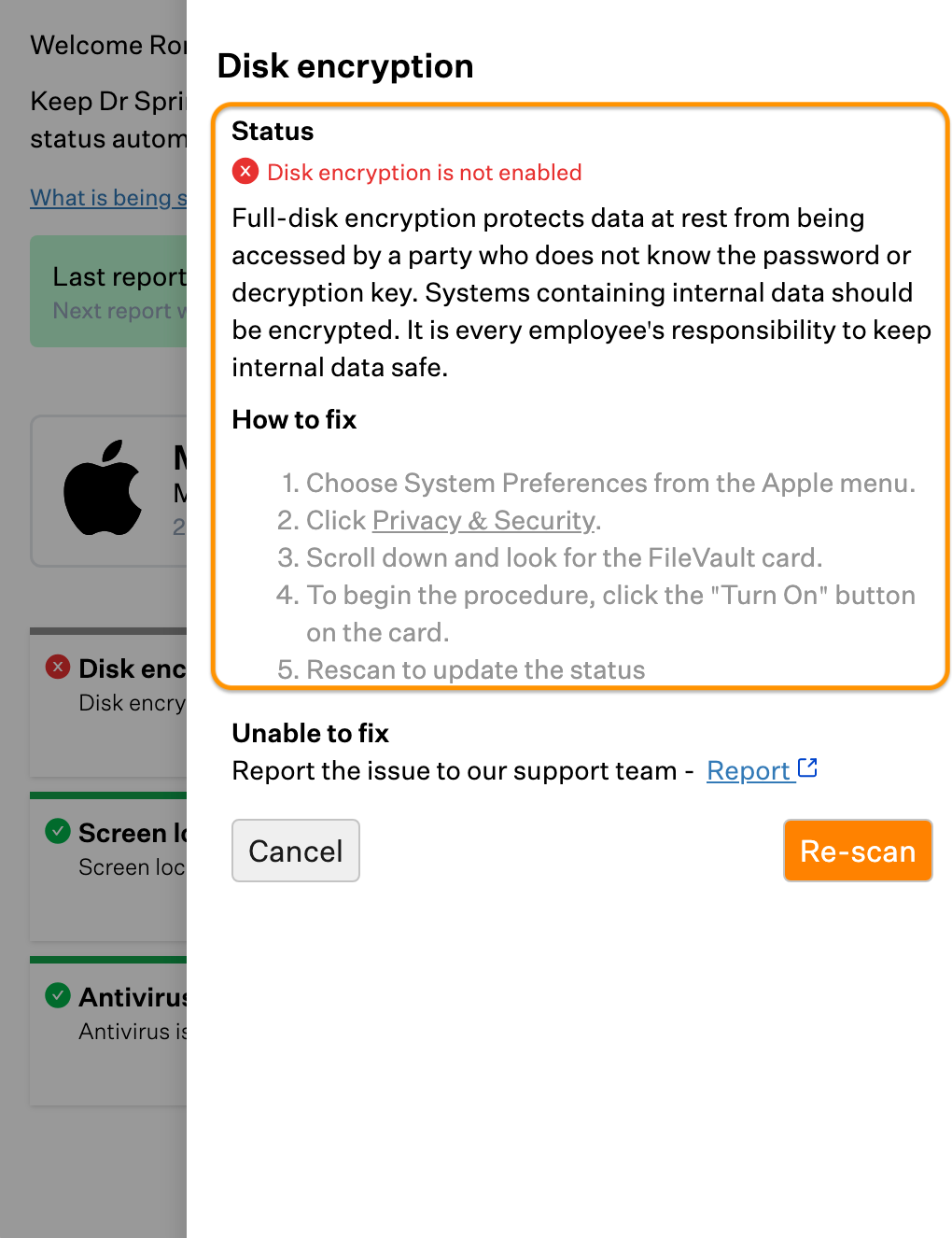 * Information Collected: Dr. Sprinto's checks include OS version, screen lock status, and hard disk encryption to ensure SOC 2 compliance. Results are displayed in the app interface and are never sent without explicit permission.
