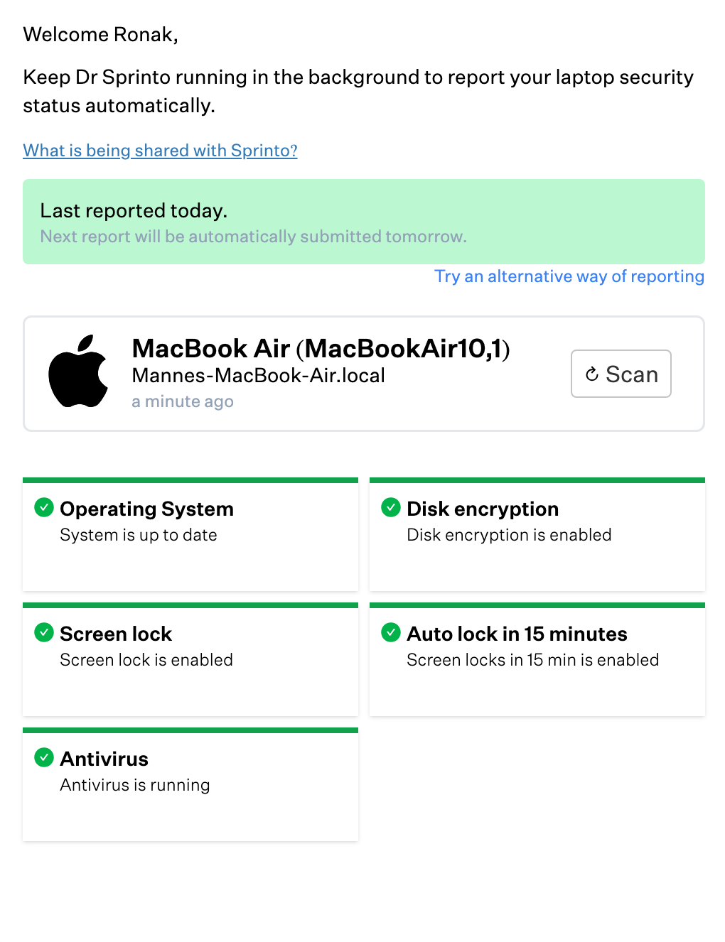 * Once you’ve updated your device's configuration, return to Dr. Sprinto and click **Re-scan**. You should see a green check mark against all device configurations.<br>