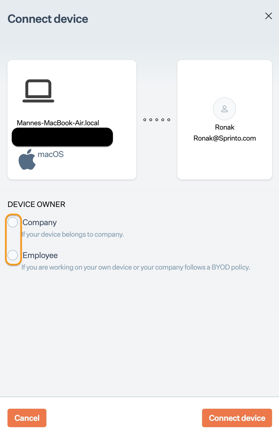 * Select a device owner option, and click Connect device.<br>