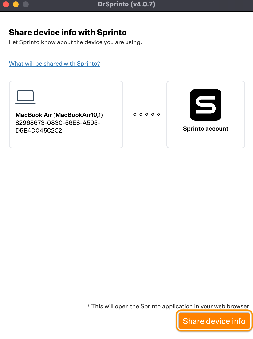 * Click Share device info to report your device health on Sprinto. This opens [Sprinto’s employee portal](https://app.sprinto.com/) on your default web browser. If you are not already logged in, you may need to log in with your credentials.<br>