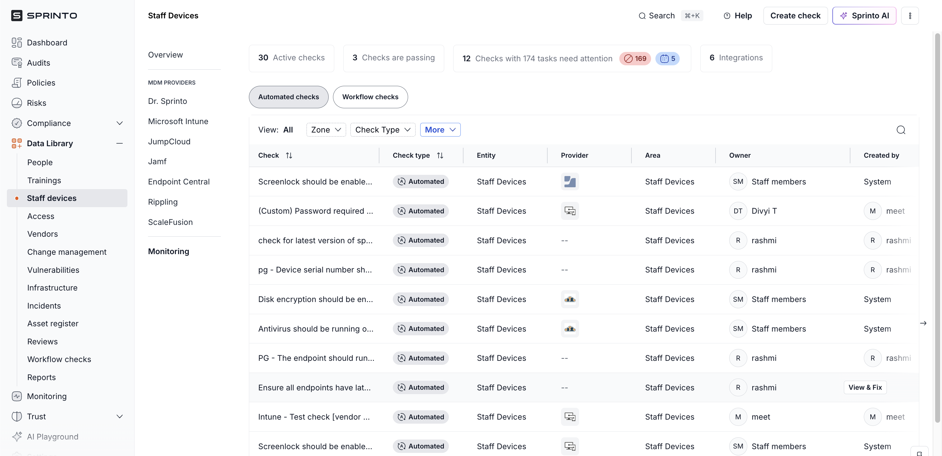Track and manage device compliance status across Dr. Sprinto, MDMs, and manual workflows using the Monitoring tab in Sprinto.