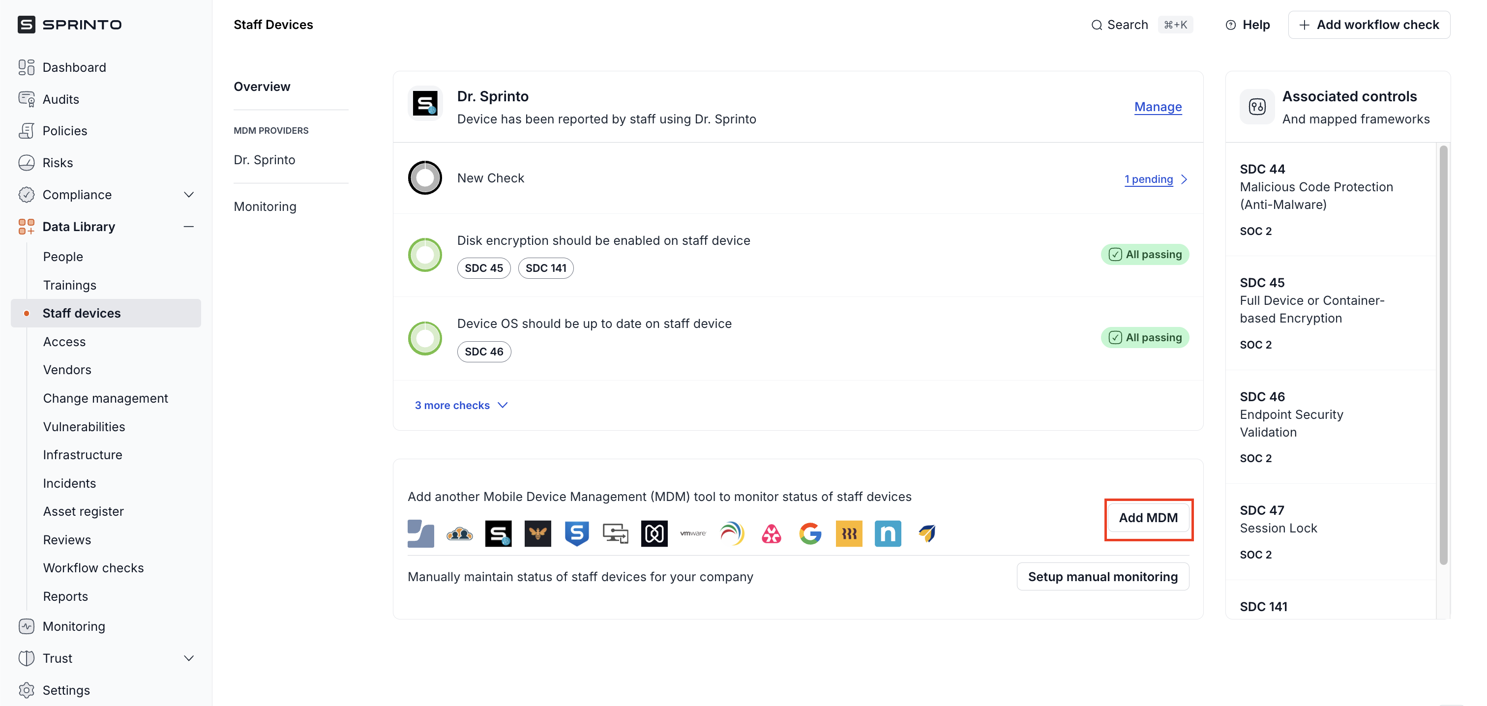 Once configured, Sprinto fetches device configuration details periodically and flags non-compliant devices across your mapped compliance frameworks.