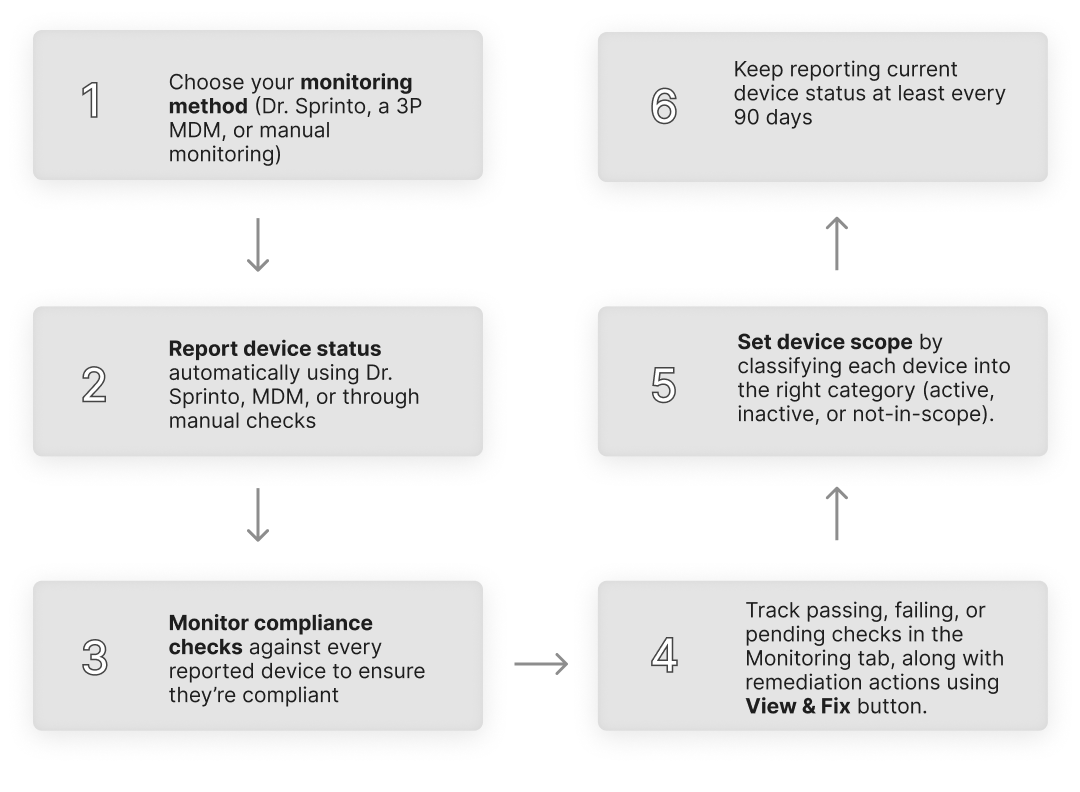 * **Use Dr. Sprinto** – Sprinto’s native MDM tool. Install the app on staff devices to automate compliance checks (OS version, encryption, antivirus, etc.).