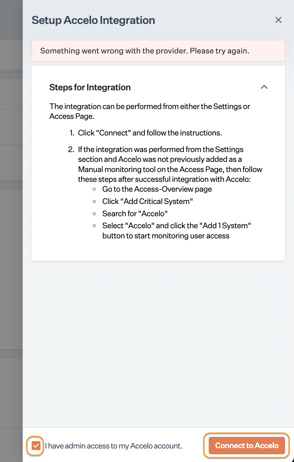 Ensure you have "Admin" access on the Accelo account you want to integrate.