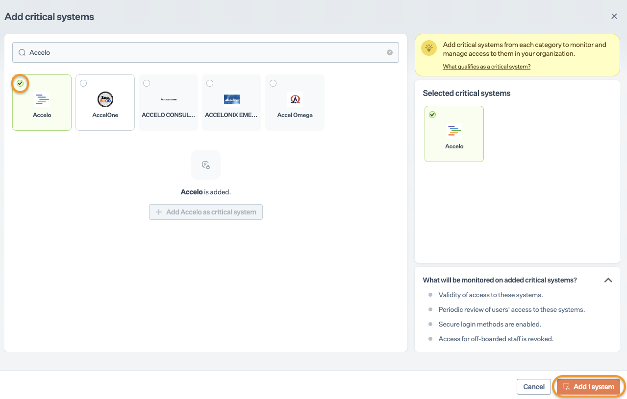 Select Accelo and click Add System. You can use the search bar for quick navigation.