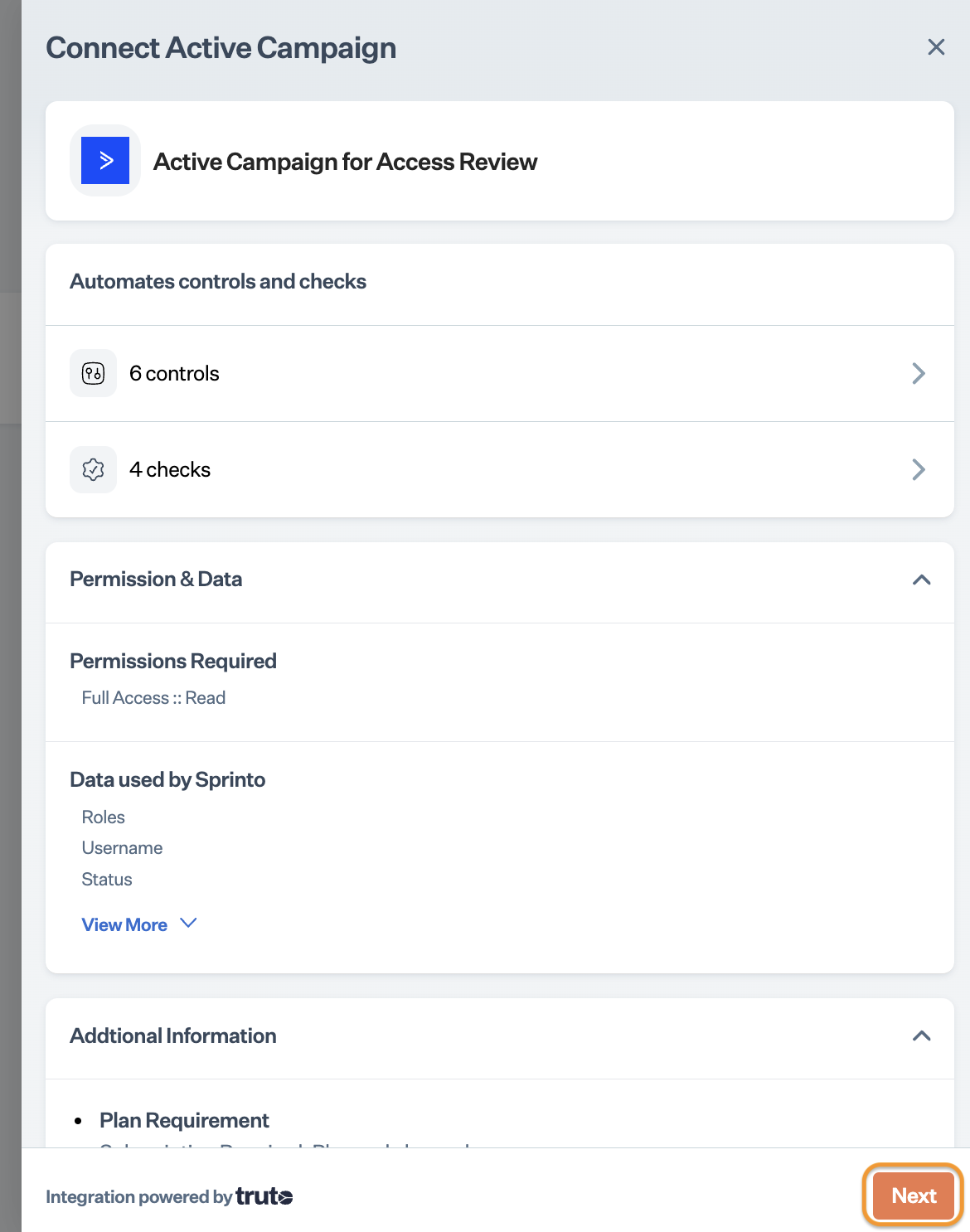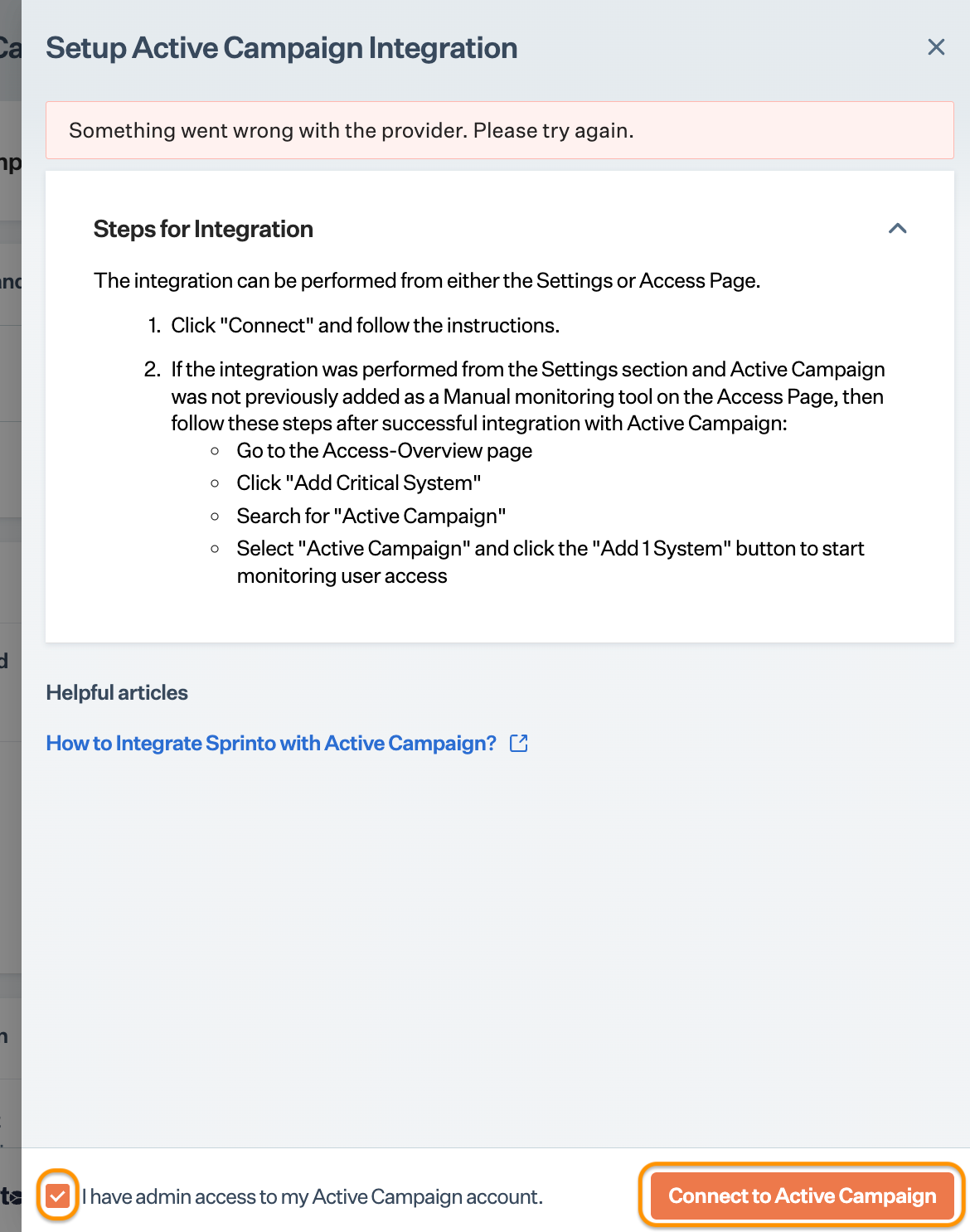 * On Sprinto app, go to Settings > Active integrations and click Connect next to the ActiveCampaign icon.