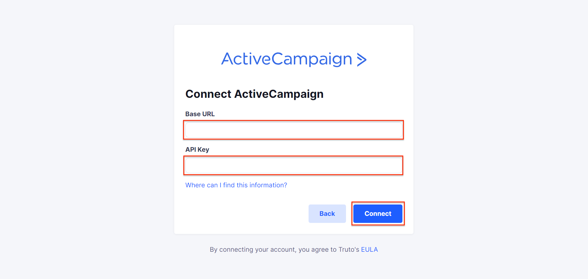 * On ActiveCampaign authentication page, enter the API URL and API key copied earlier in the respective fields, then click Connect.\