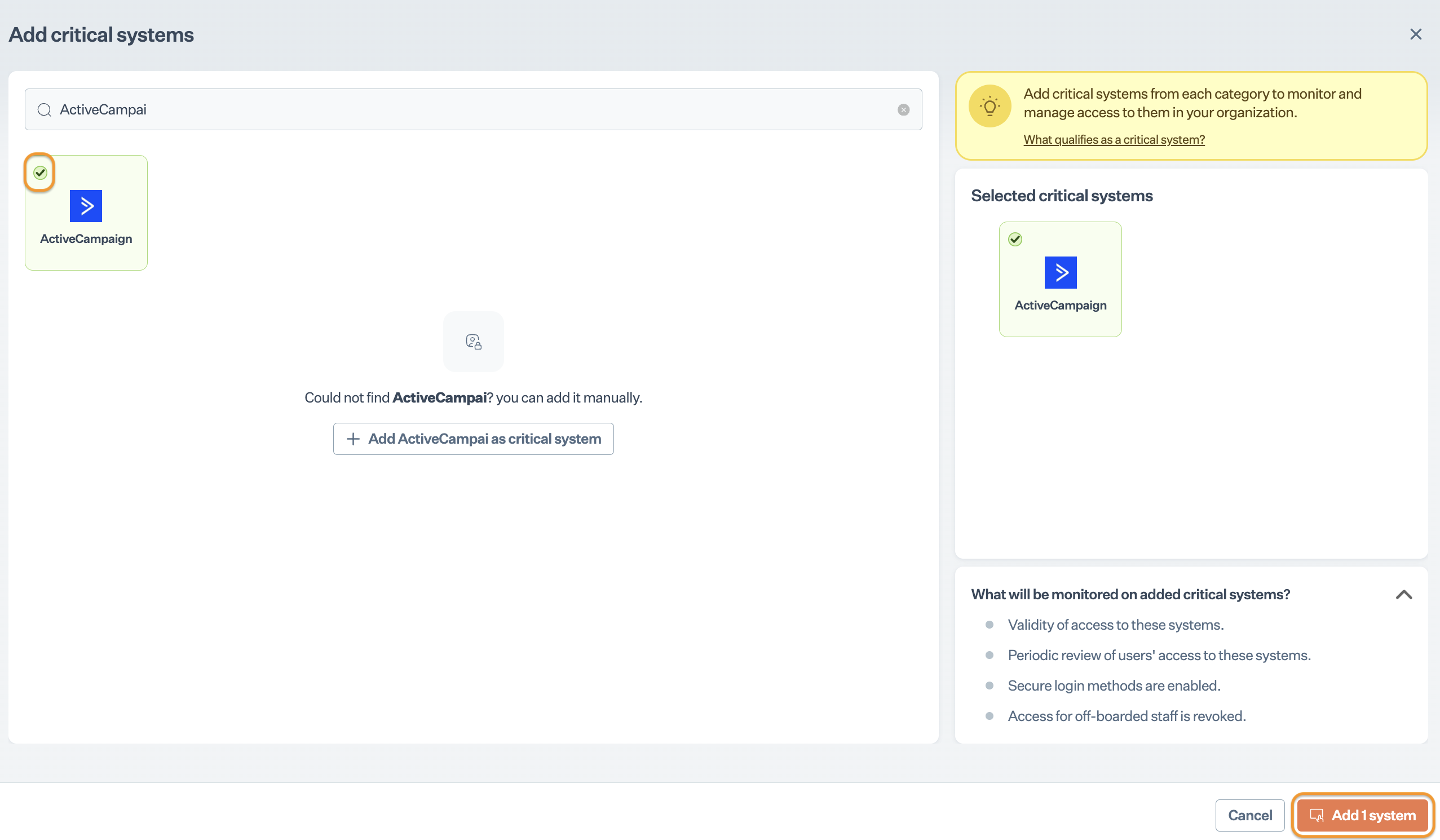 * On Add Critical Access System page, select ActiveCampaign and click Add System.