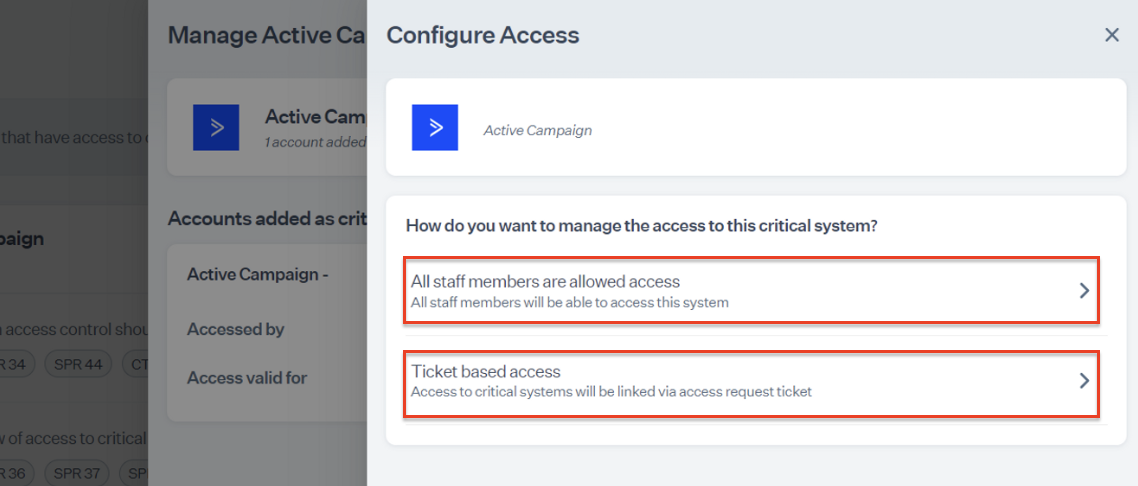 <table><thead><tr><th width="552.65234375">Sprinto check</th><th>Reference procedure</th></tr></thead><tbody><tr><td>User should be identified</td><td><a href="../../data-library/access/dashboard-actions/view-and-map-staff-access">How to fix</a></td></tr><tr><td>ActiveCampaign access should be removed for offboarded user</td><td><a href="../../monitors/authentication-and-access-monitors/resolve-sprinto-check-for-removing-access-for-offboarded-users">How to fix</a></td></tr><tr><td>Critical system access control should be configured</td><td><a href="../../data-library/access/dashboard-actions/view-and-map-staff-access">How to fix</a></td></tr><tr><td>User access to Critical System should be valid<br><br>Note: The user access to the critical system becomes valid if the respective Org role is added to the system.</td><td><a href="../../data-library/access/dashboard-actions/view-and-map-staff-access">How to fix</a></td></tr></tbody></table>