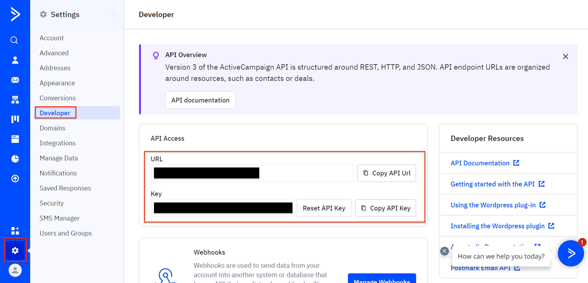 * On the ActiveCampaign portal, go to Settings > Developer, copy the API URL and API Key, and note them securely. You’ll need this API key and URL on Sprinto to build integration.