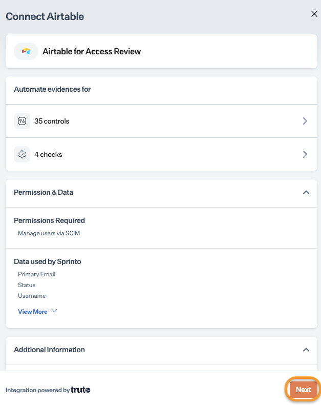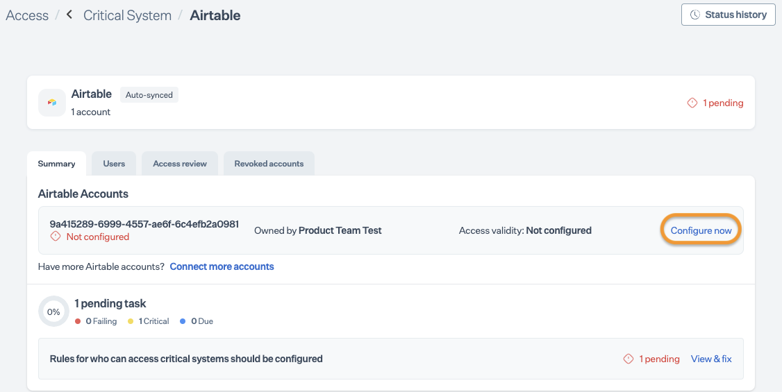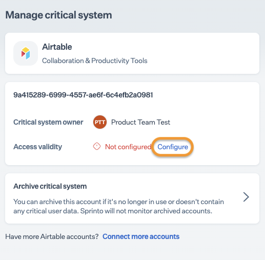 After completing Step 4, allow 15 to 20 minutes for Sprinto to finish the data syncing process. Sprinto may take few hours to evaluate the synced data and activate relevant Sprinto checks. If needed, visit Data Library > Access > Critical System to check for pending tasks next to Airtable.