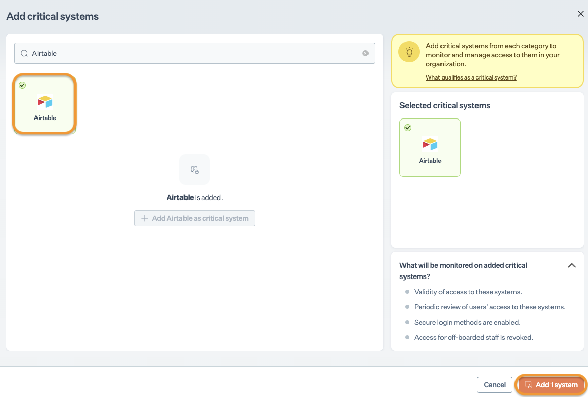 On Add Critical System page, select Airtable and click Add system.