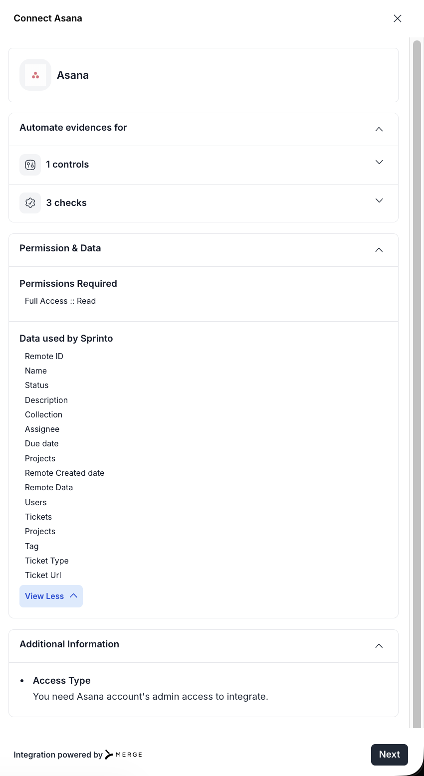 Sprinto connects to Asana using MergeDev’s secure OAuth-based integration.