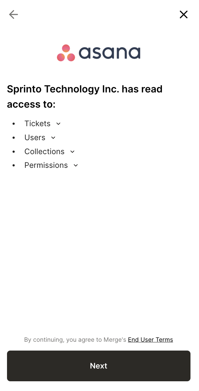 Asana is connected via a third-party integration provider (MergeDev). Sprinto does not directly connect to Asana APIs.