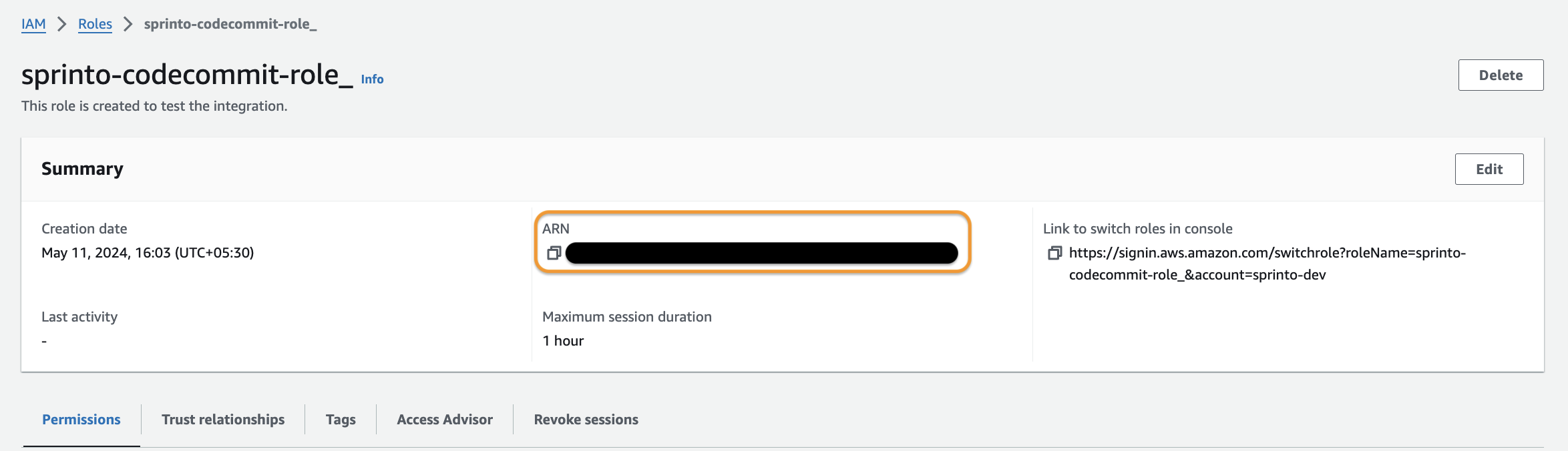 This integration ensures secure and efficient collaboration by establishing necessary access permissions and configurations for AWS CodeCommit repositories within Sprinto. Sprinto utilizes the IAM role to retrieve essential details, facilitate checks, and maintain compliance.