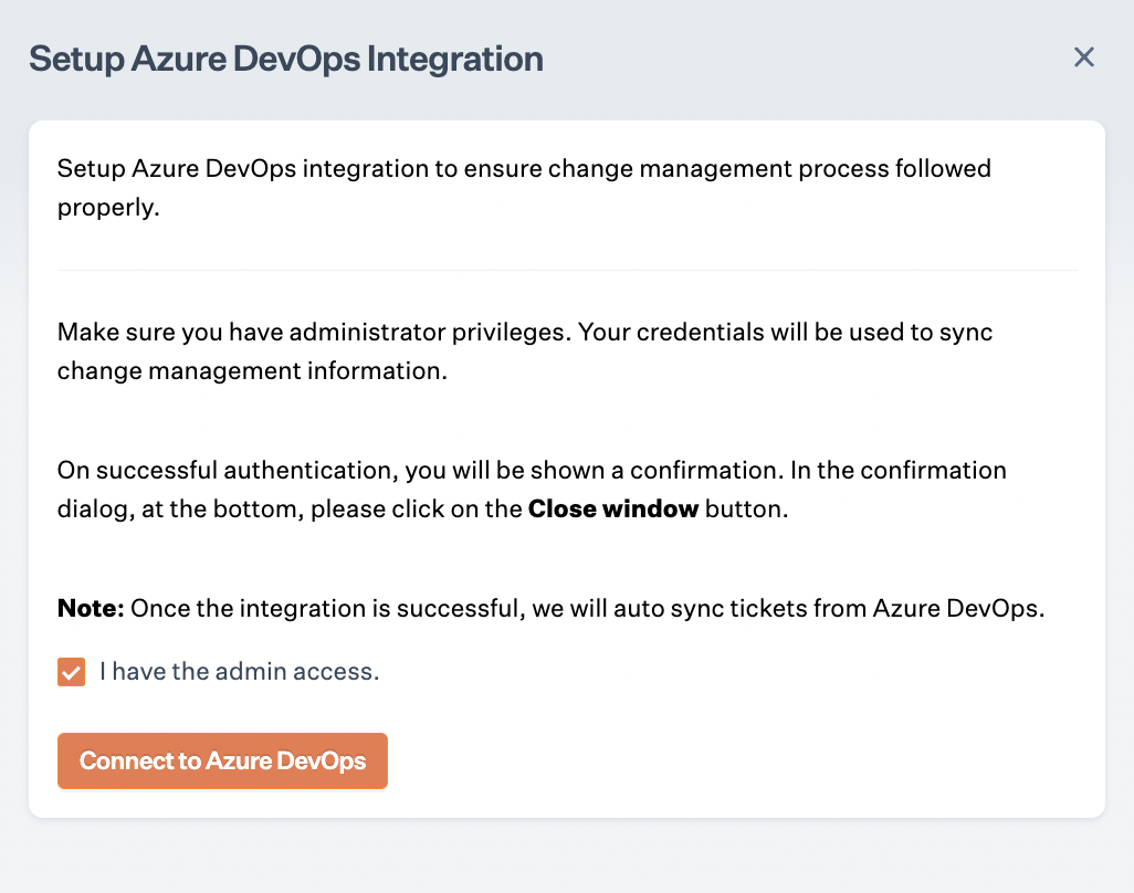 Step 6: Read all the instructions in the pop-up window and check the box confirming you have admin access and click on Connect to Azure DevOps