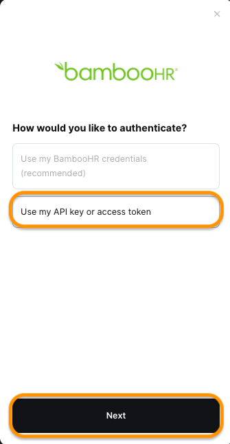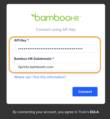 * In the respective fields, enter the API key and the subdomain of your BambooHR account you copied from Step 1, then click Connect.