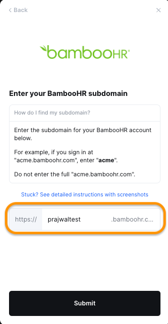 * Enter your BambooHR account subdomain, and click Submit.