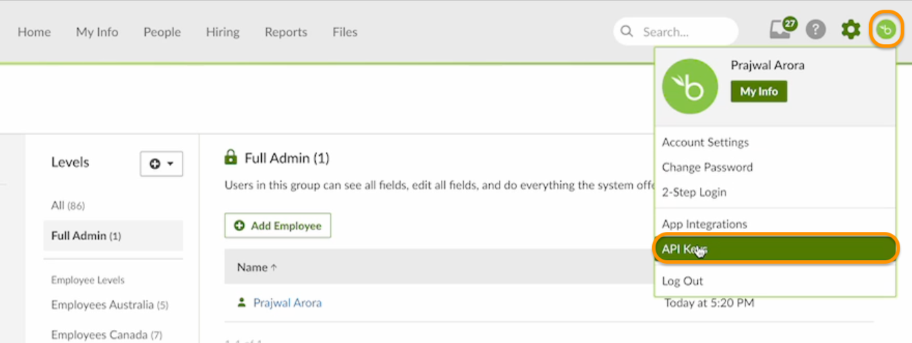 * Ensure you have Full Admin access to the BambooHR account. To verify, go to Settings > Access Levels > Full Admin on your BambooHR account.