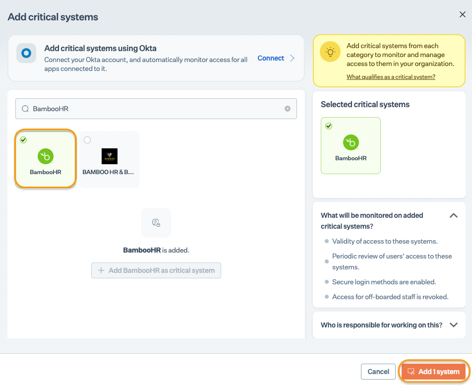 * Select BambooHR from the critical system library, then click Add Systems. \