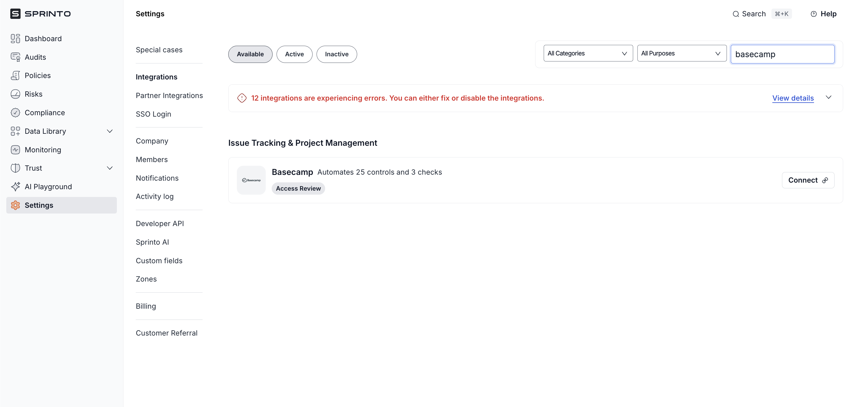 Go to Settings > Integrations > Available, and click Connect next to Basecamp.