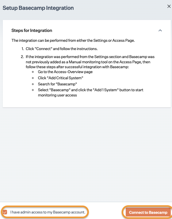 Ensure you have “Admin” access on the Basecamp account you want to integrate.