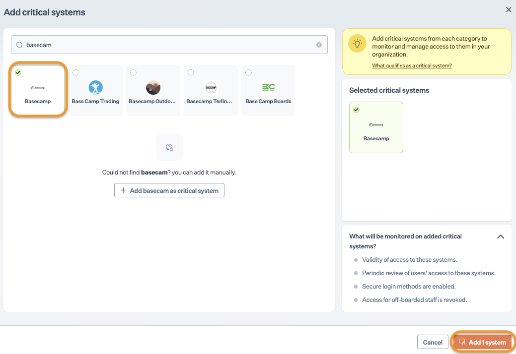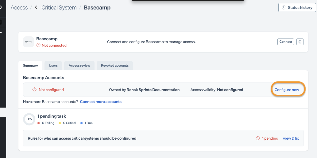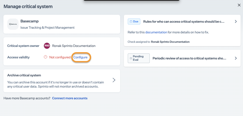 After completing Step 4, allow 15 to 20 minutes for Sprinto to finish the data syncing process. Sprinto may take few hours to evaluate the synced data and activate relevant Sprinto checks. If needed, go to Data Library > Access > Critical System to check for pending tasks next to Basecamp.