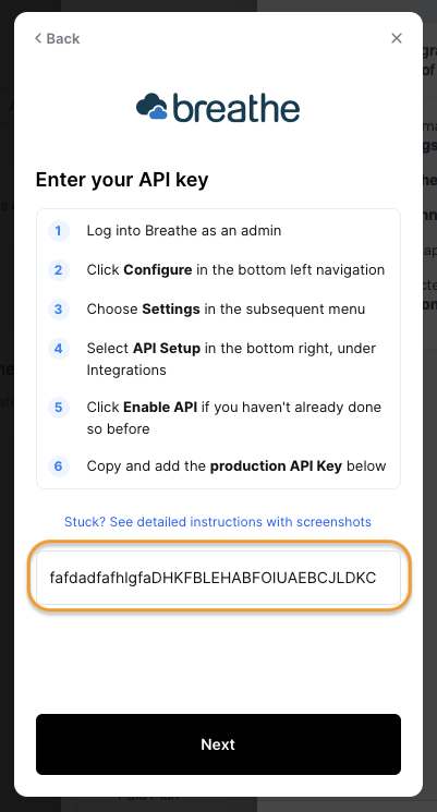 1. Refer to[ Breathe documentation](https://developer.breathehr.com/documentation/getting_started?partial=getting_started) to generate an API key. Copy the generated API key securely.