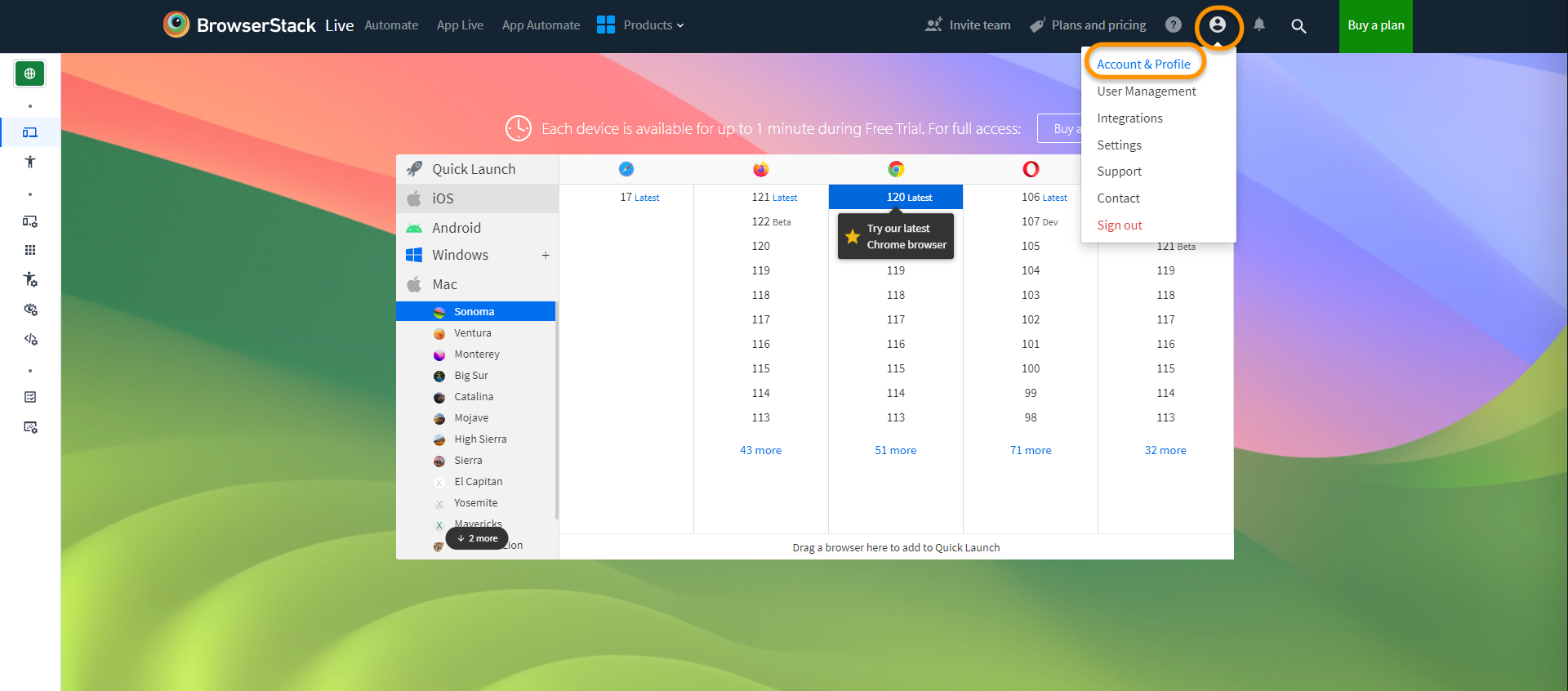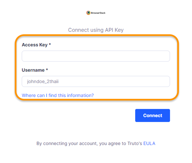 Get the username and access key from your BrowserStack account.
