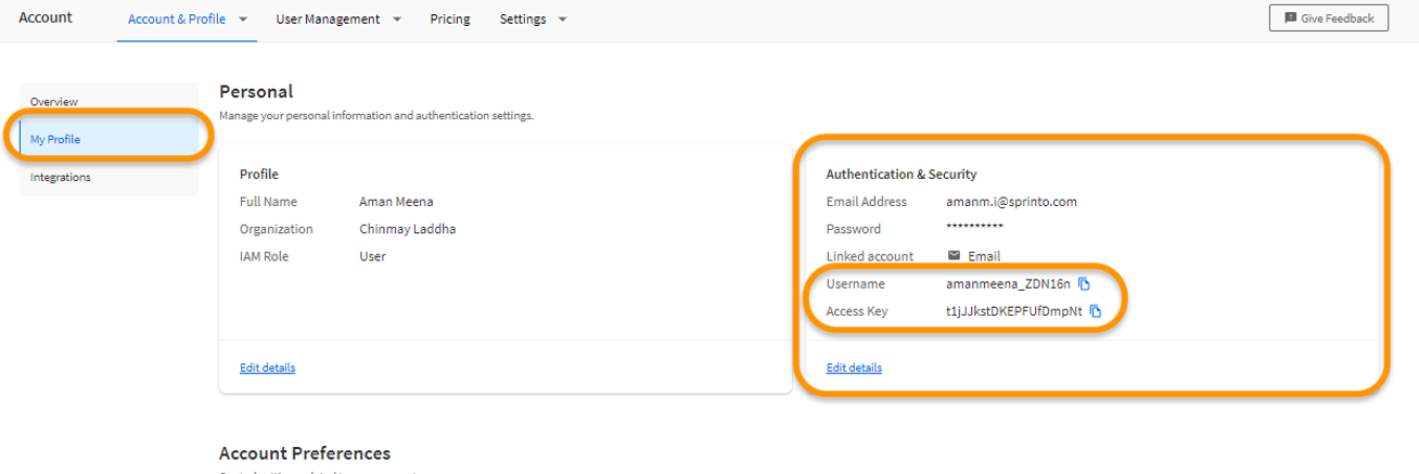 Select My profile, and copy the Username and Access key under Authentication & Security. You will need these details to build integration on Sprinto.