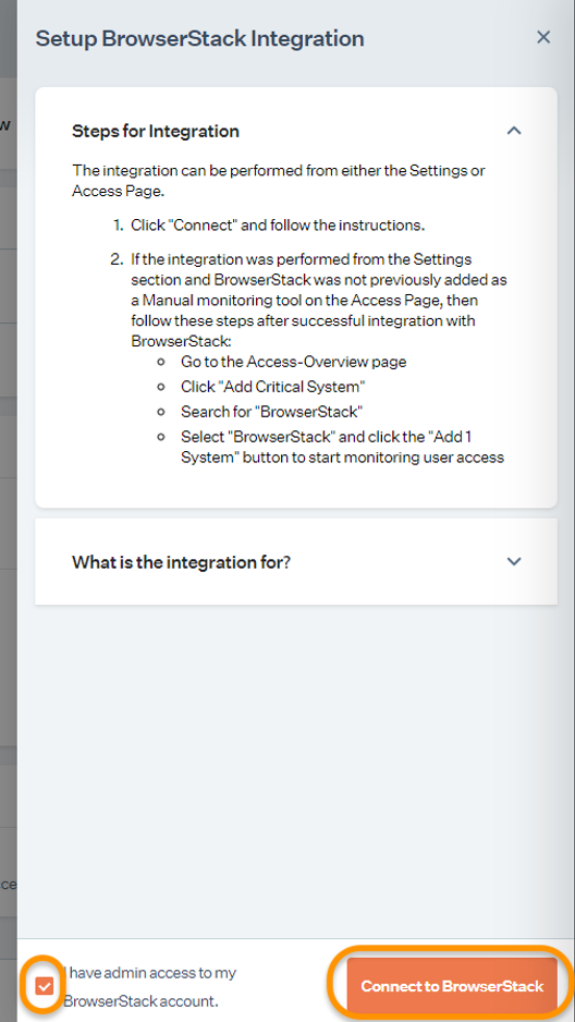 Ensure you have "Admin" access to the BrowserStack account intended for integration.