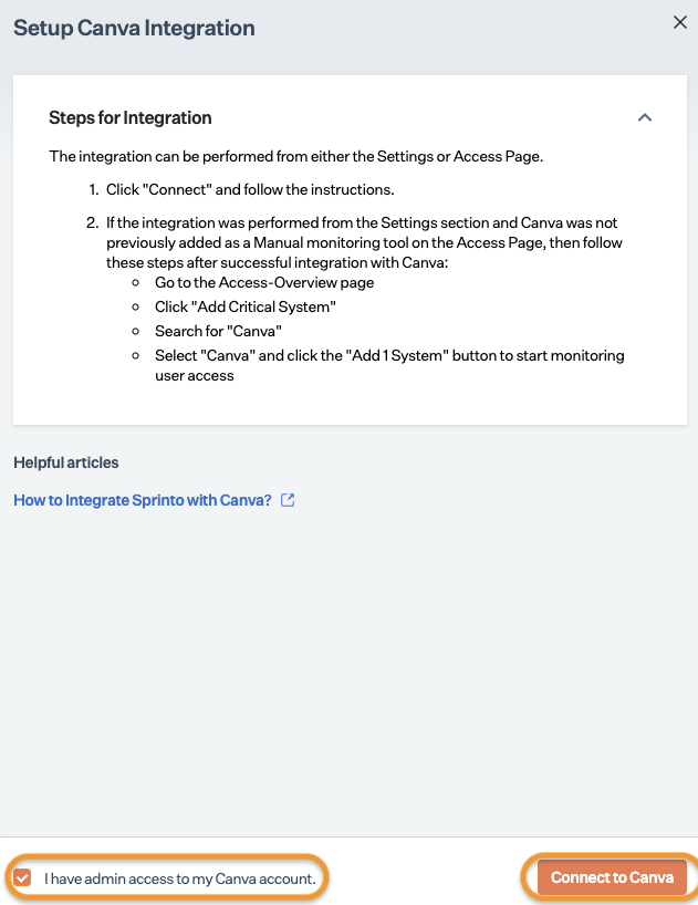 * Ensure you have “Admin” access on the Canva account you want to integrate.
