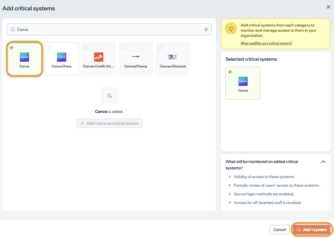 * Go to Data Library > Access > Critical systems, and select Canva.