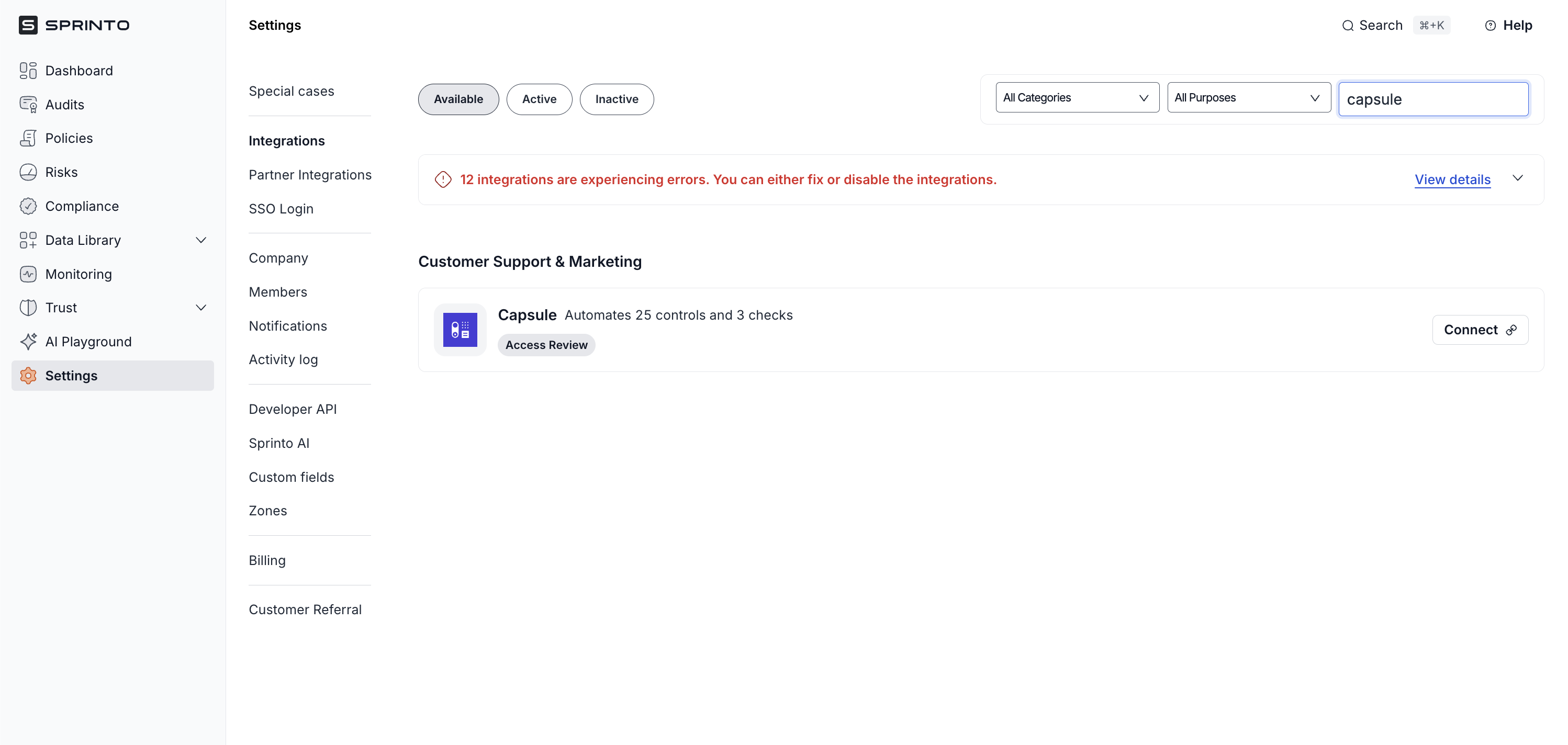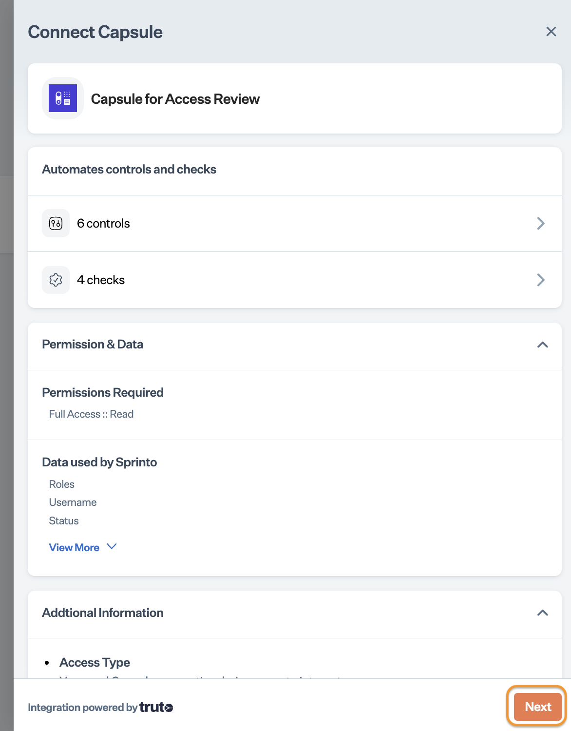 After completing Step 3, allow 15 to 20 minutes for Sprinto to finish the data syncing process. Sprinto may take up to 24 hours to evaluate the synced data and activate relevant Sprinto checks. If needed, visit Security Hub > Access > Critical System to check for pending tasks next to Capsule.
