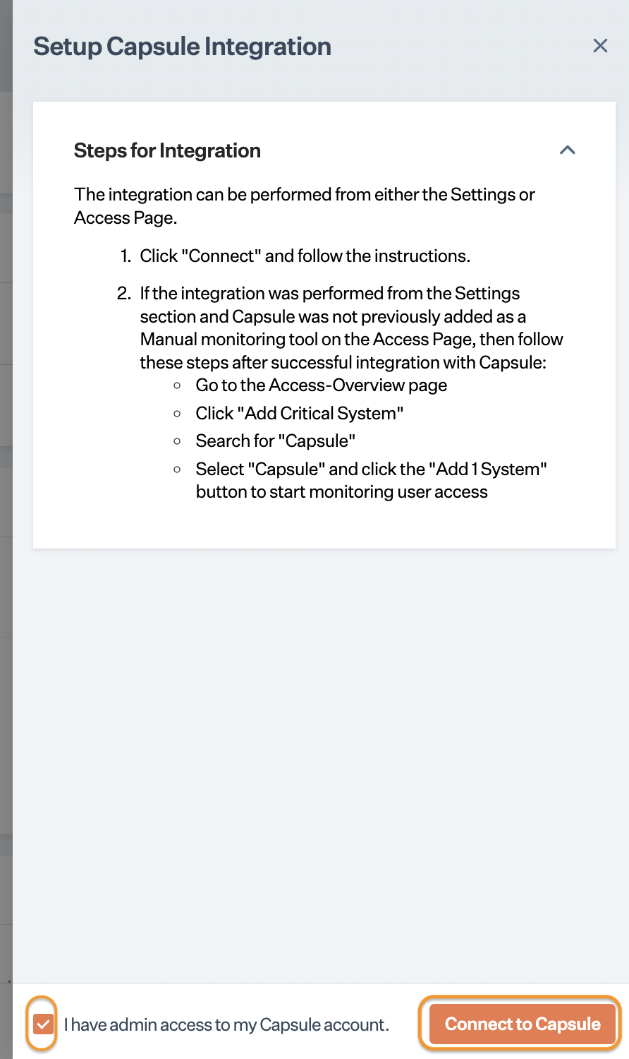 Ensure you have “Admin” access on the Capsule account you want to integrate.