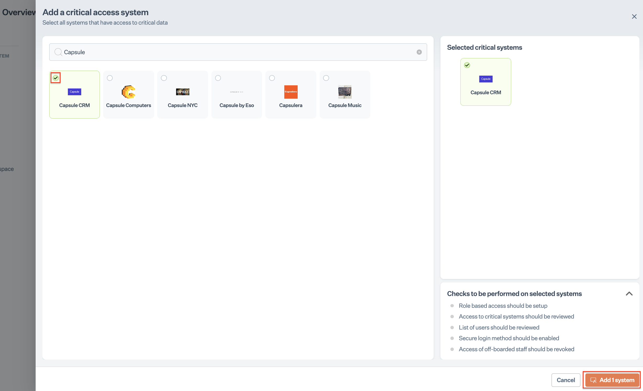 On Add a Critical System page, select Capsule CRM and click Add system.
