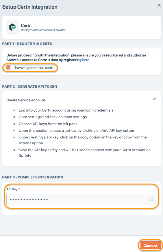 Select the acknowledgment checkbox, enter the API Key copied from Step 1, and click Connect. Note: Ensure you have a pop-up window enabled on your web browser.