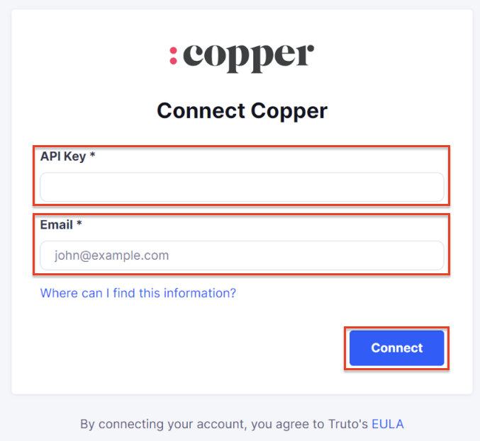 4. On **Copper integration** page, enter the API key, Email address in the respective field and click on Connect.<br>
