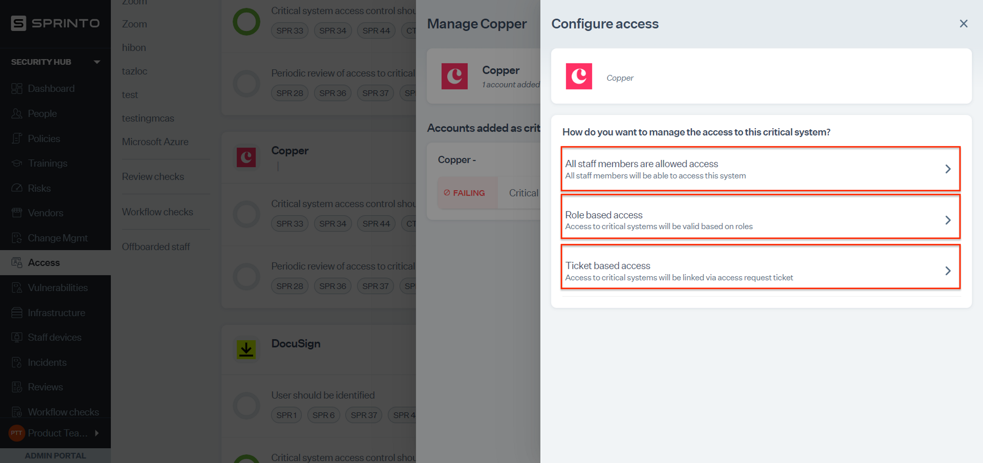 **Note**: Sprinto activates a check against any staff member with invalid access based on access type selected.