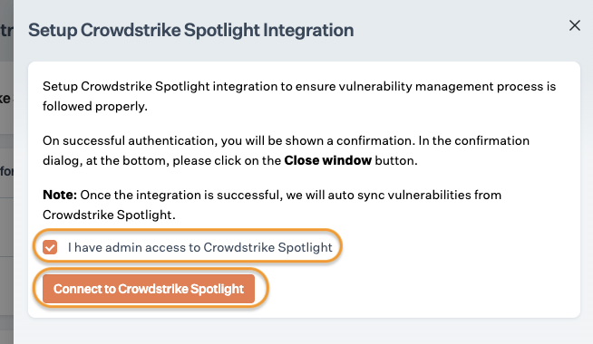 Select the acknowledgment checkbox, and click Connect to Crowdstrike spotlight. Note: Ensure the pop-up window is enabled on your browser.