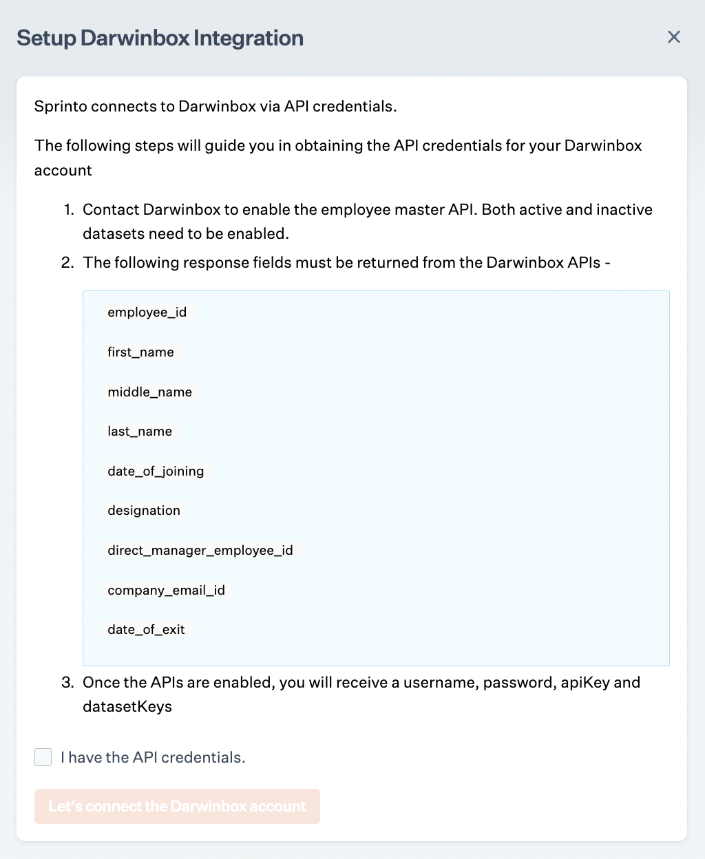 Step 6: Select the checkbox, I have the API credentials, and click on Let's connect the Darwinbox account.