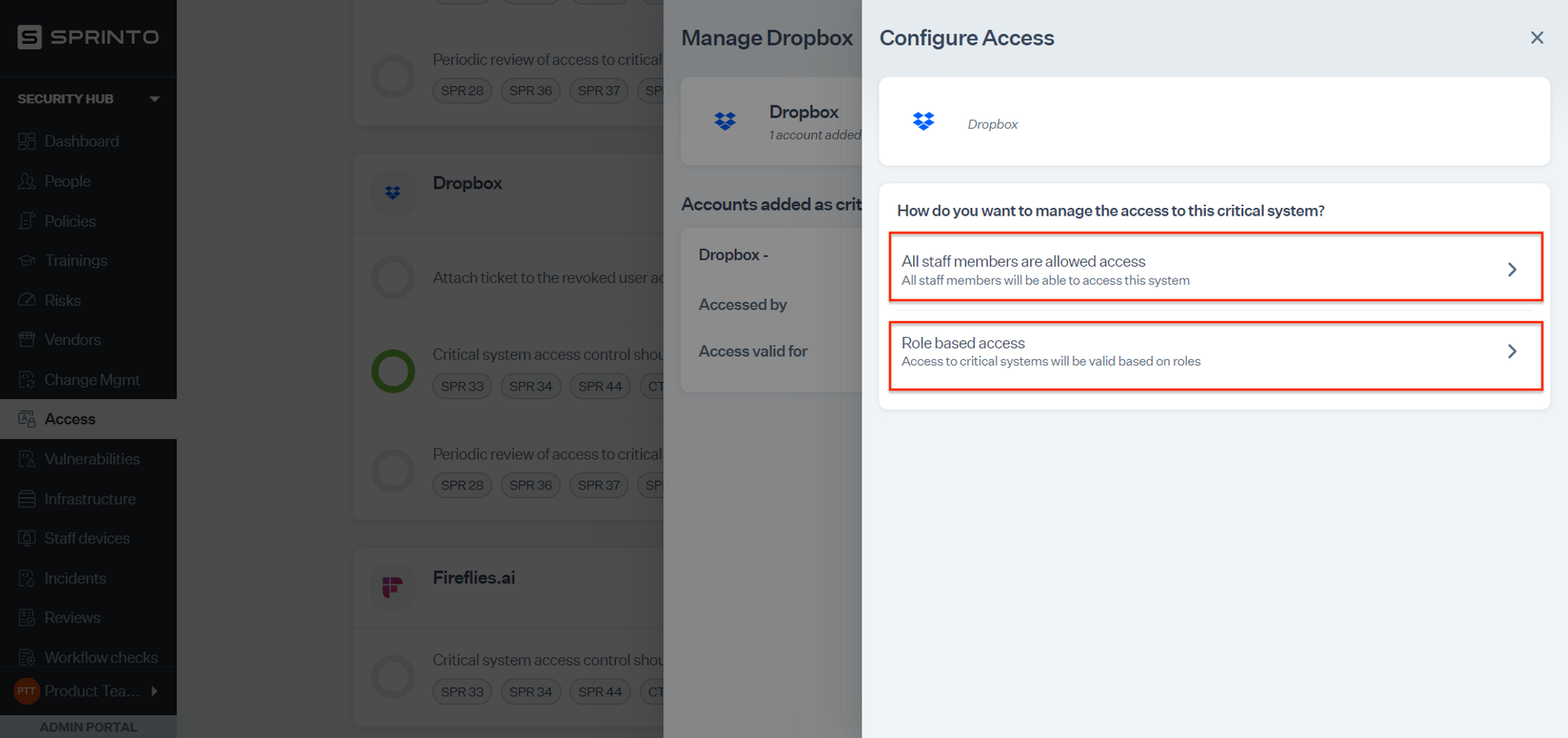 * If a staff member with Dropbox account access is offboarded, Sprinto activates a check against that staff member to revoke Dropbox access.